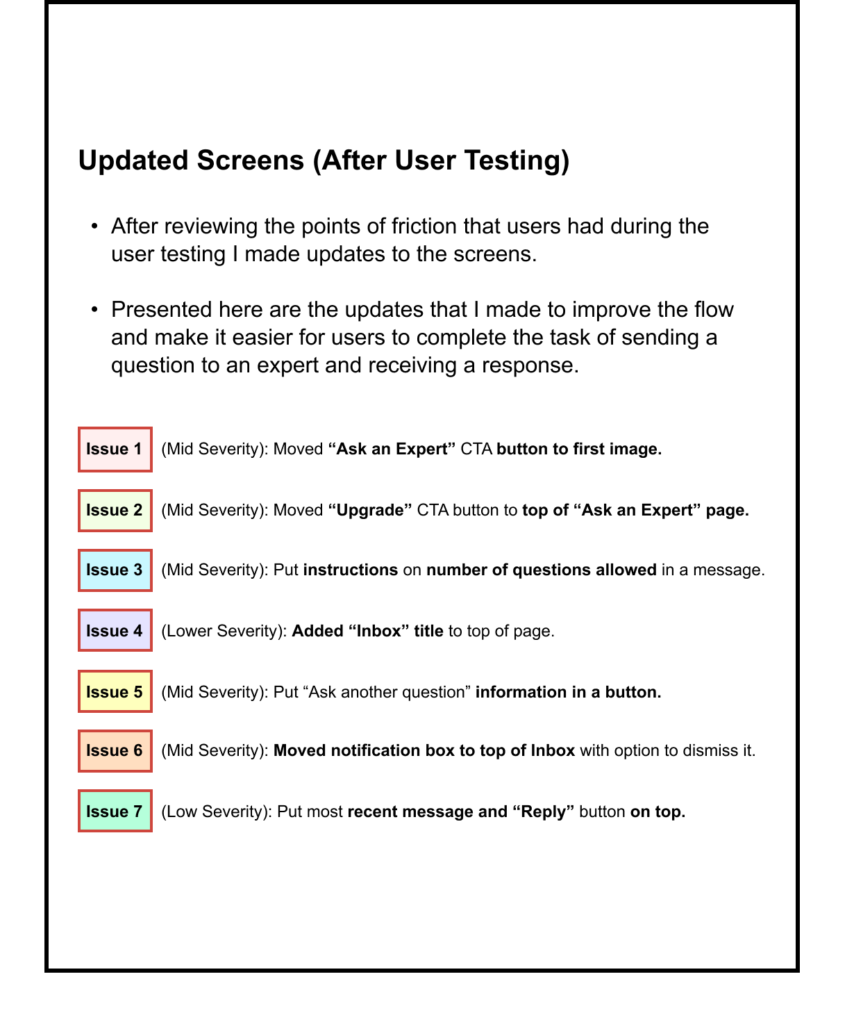 After mid fidelity screens were designed I ran a user test to see how easy it was for users to complete the task of sending a message to an expert and receiving a response from them in their Inbox. 5 people participated in this test.