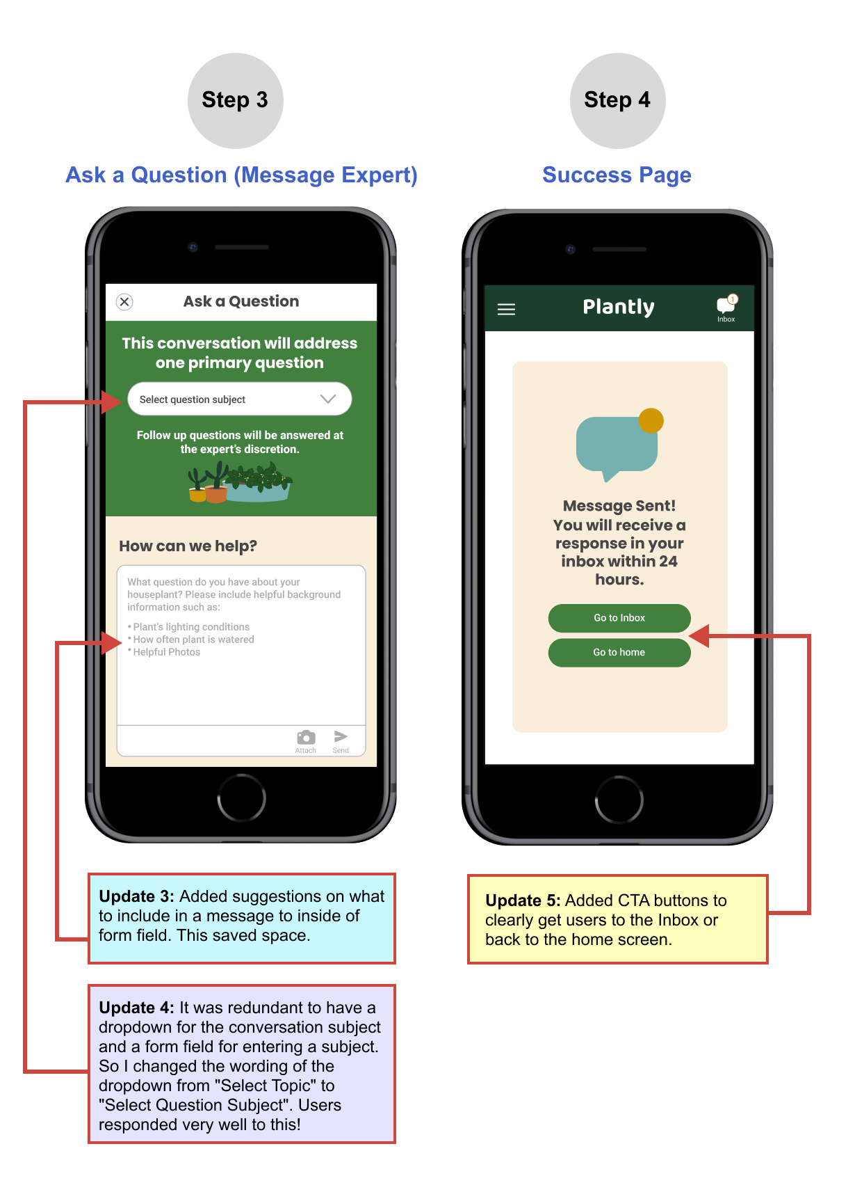 To understand a user like Sarah better I mapped out how her journey might look if she were to complete the task of sending a message to an expert for personal advice on bringing her Pilea plant back to optimal health. Creating user journeys is a very helpful tool to understand a user’s emotions as they complete tasks and are helpful ways to find opportunities to eliminate pain points.
